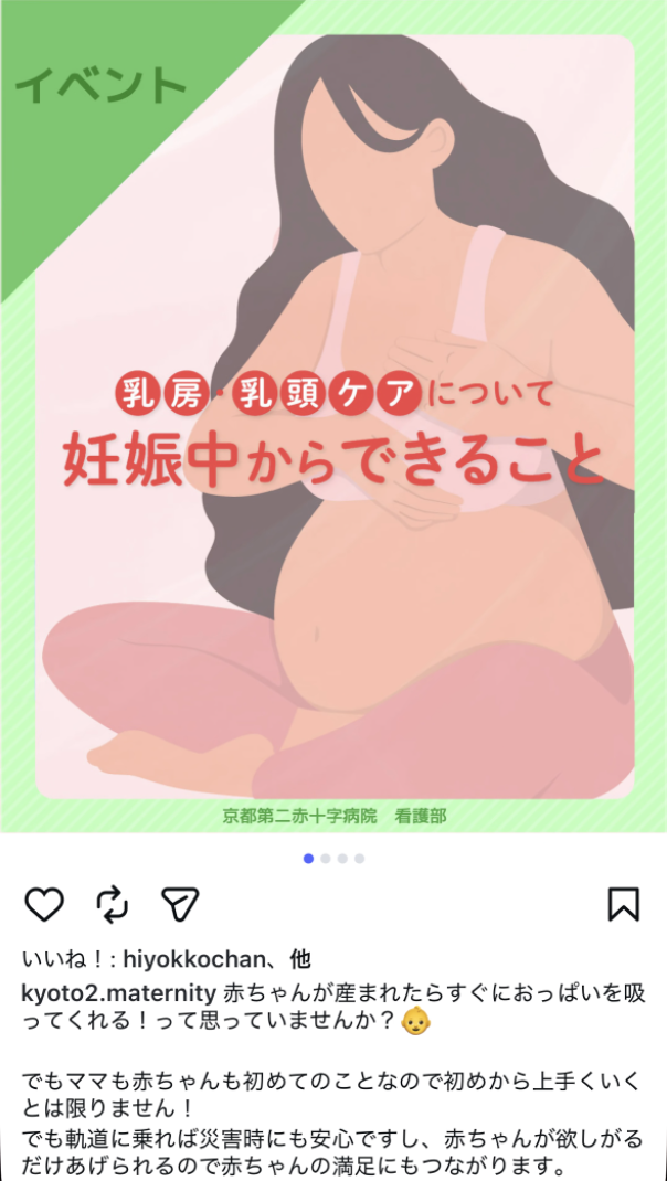 京都第二赤十字病院様の母子センター向けInstagramアカウントの制作では、病院の母子医療に関わる情報を発信するためのSNS運用設計を行いました。本制作では、視覚を重視した情報発信によって、妊産婦さんやそのご家族、医療従事者などの潜在的なフォロワーに向けたコミュニケーション導線を明確化しています。母子センター特有のケアや日常の取り組みを見せることで、アカウントに訪れた方が必要な情報へスムーズに辿り着ける構成を意識しました。